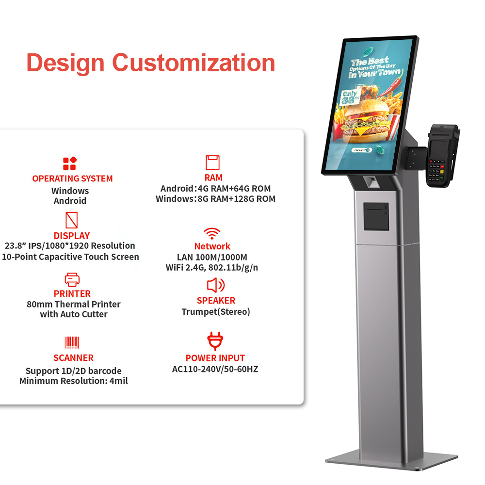 This Ordering Payment Kiosk is a professional-grade desktop POS system designed for high-efficiency retail and hospitality environments. Featuring a vibrant 21.5-inch Full HD (or optional 4K) primary display, it provides an immersive interface for customer-led transactions. The system supports Android with full SDK functionality, allowing for seamless software integration. Its robust build is engineered for longevity, with an operating life exceeding 50,000 hours and a wide temperature tolerance, making it a reliable pillar for 24/7 business operations.